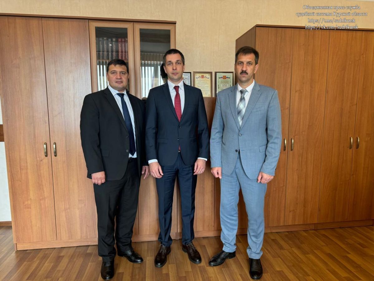 Председатель Курского областного суда Олег Кравченко и начальник Управления Судебного департамента в Курской области Игорь Нисонов поздравили Антона Хмелевского с вступлением в новую должность.
