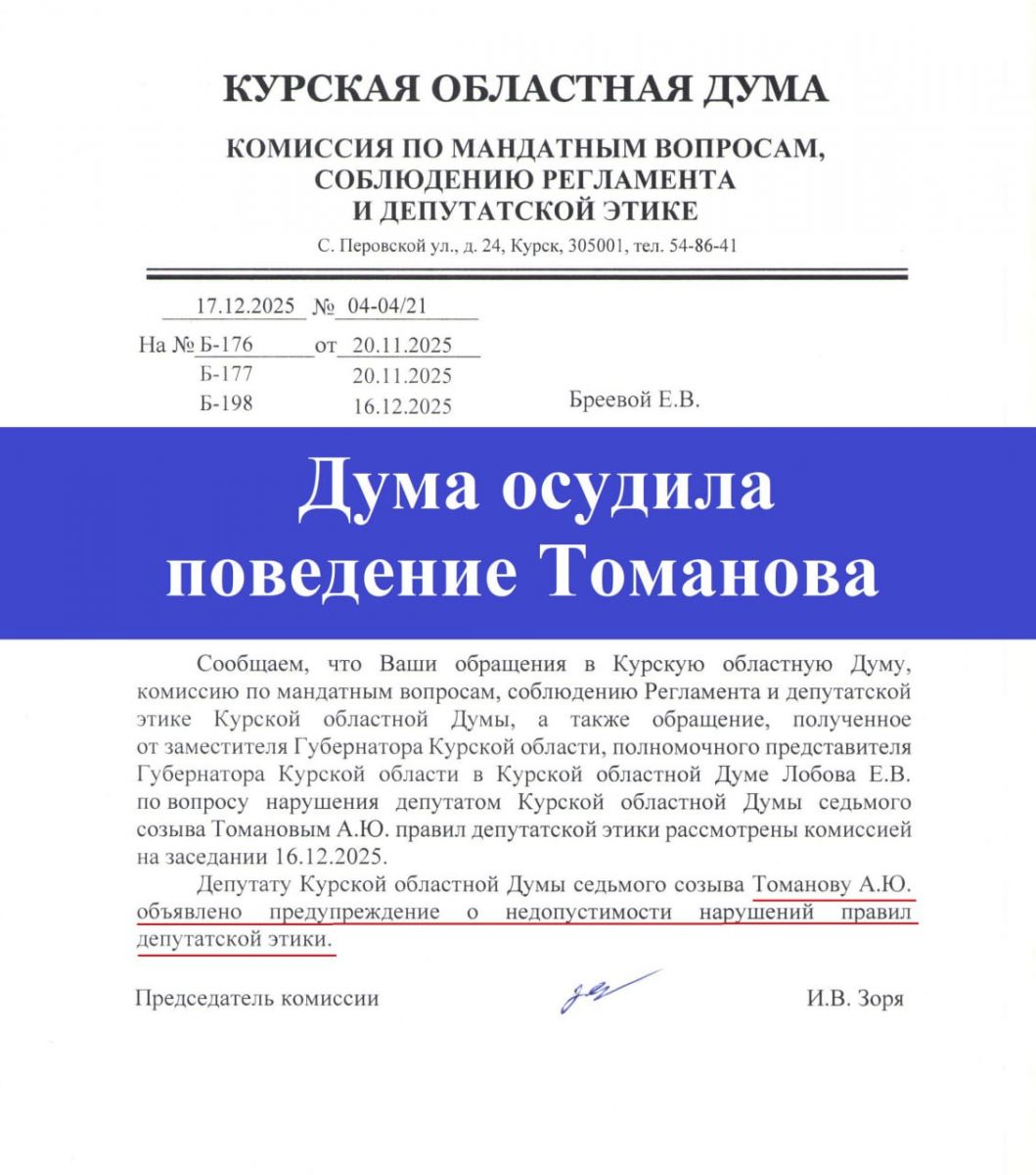 В Курской областной Думе Томанову объявлено предупреждение за нарушение этики