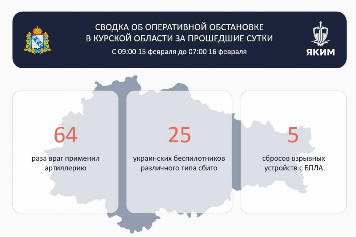 За этот период было уничтожено 25 украинских БПЛА. 64 раза ВСУ обстреливали из артиллерии курское приграничье.