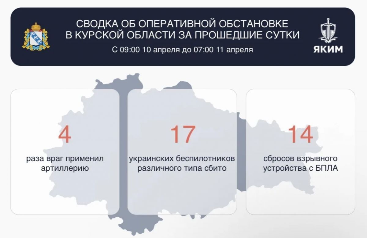 В Курской области за сутки уничтожены 17 беспилотников, обстрелов нет, пострадавших нет